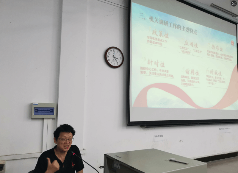 孙军老师围绕“调研报告撰写技巧”的主题,结合省政府工作经验,从搞好调研报告工作的重要意义、要遵循的重要原则、机关调研工作的主要特点、调查研究的种类及基本方法和技巧、如何写好决策咨询研究报告、调研中的形式主义及主要表现、如何克服调研中的形式主义等七个方面进行了详细讲解。孙军老师指出,重视调研是践行党的性质宗旨的有效途径,是坚持马克思主义认识论的重要体现,是坚持实事求是的必然要求,是对中华优秀传统文化的传承弘扬。调查研究要遵循客观性、全面性、系统性、群众性、科学性和实践性等原则,有直接调查法、间接调查法、网络调查法等调查方法。孙军老师结合具体调研报告案例,指出好的调研报告标准是“七有一无”,即文有趣(趣味)、文有理(道理)、文有文(文采)、文有物(事物)、文有识(见识)、文有情(感情)、文有句(妙句)、文无法(定法)。好的调研报告要做到“七清三结合”,即基本情况清、群众期盼清、各方评价清、存在问题清、对策建议清、现成经验清、工作成效清,做到点面结合、感性认识与理性分析结合、定量与定性分析结合。孙军老师最后强调,调查研究要反对形式主义,要真正深入基层一线,掌握实际情况,解决存在问题。