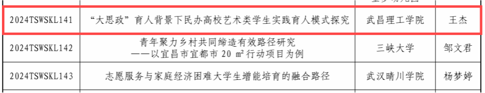 据悉,2024年度湖北省共青团和青少年工作研究课题共计立项169项,其中重点课题9项,一般课题160项。此次pp电子网站同时获批立项的还有校团委副书记王杰申报的《“大思政”育人背景下民办高校艺术类学生实践育人模式研究》(立项编号:2024TSWSKL141)。