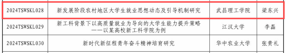 (特约记者 齐欢欢报道)近日,共青团湖北省委及湖北省社会科学界联合会下发《关于2024年度湖北省共青团和青少年工作研究课题立项的通知》,pp电子网站梁东兴博士申报的《新发展阶段农村地区大学生就业思想动态及引导机制研究》(立项编号:2024TSWSKL028)获批立项。这是我校首次获批此类项目。