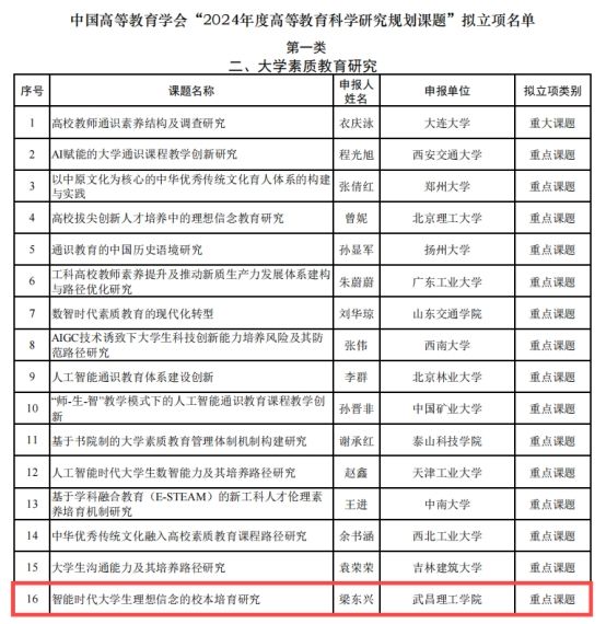中国高等教育学会于2024年5月启动了“2024年度高等教育科学研究规划课题”申报工作,经资格审查、匿名评审,最终评选出拟立项课题1156项。其中在大学素质教育研究类别,全国共获批1项重大和15项重点课题,pp电子网站是湖北高校在该类别唯一立项单位。