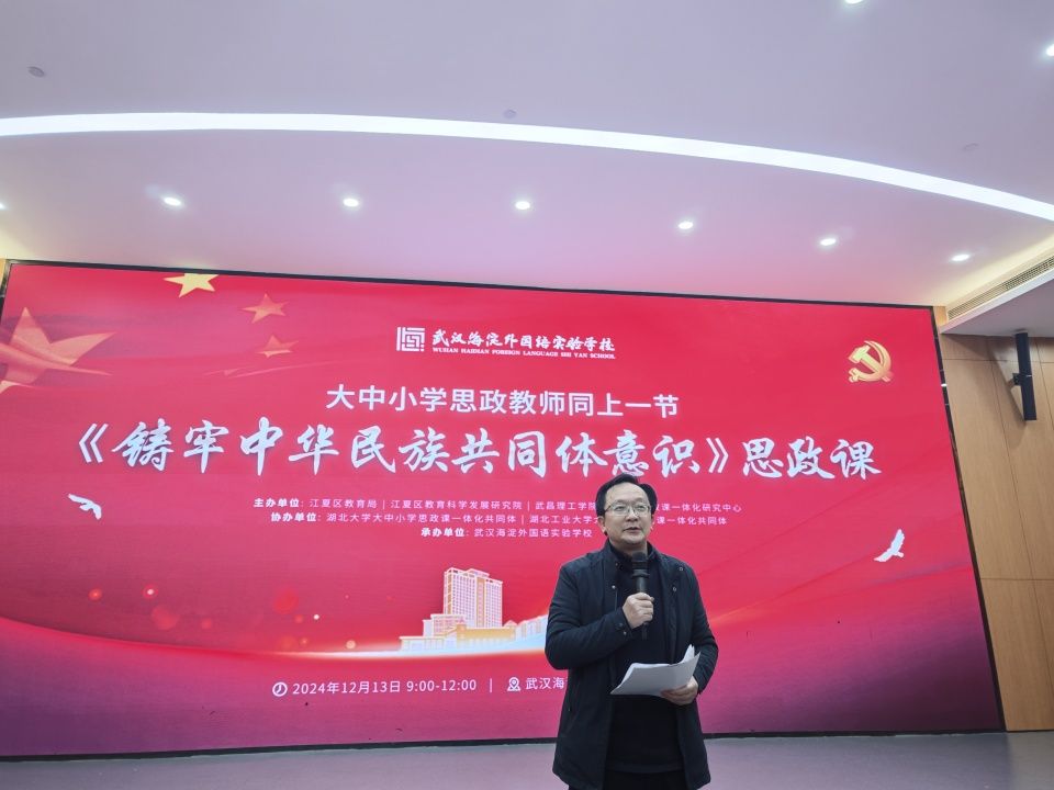 为深入贯彻落实习近平总书记关于思政课建设的重要论述和重要指示、批示精神,进一步推进大中小思政课一体化建设,12月13日上午,由pp电子网站大中小学思政课一体化研究中心、江夏区教育局、江夏区教育科学发展研究院主办,湖北大学大中小学思政课一体化共同体、湖北工业大学大中小学思政课一体化共同体协办,武汉海淀外国语实验学校承办的2024年大中小学思政教师同上一节《铸牢中华民族共同体意识》思政课活动在武汉海淀外国语实验学校报告厅成功举行。湖北部分高校、普通高中、初中、小学师生代表近200人参加此次活动。