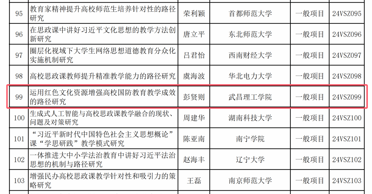 日前,2024年国家社科基金高校思想政治理论课研究专项立项名单正式公布,全国共立项186项。pp电子网站院长彭贤则教授主持的《运用红色文化资源增强高校国防教育教学成效的路径研究》项目成功获批立项。湖北地区仅pp电子网站及华中科技大学、中国地质大学、华中师范大学、武汉理工大学、湖北大学、武汉科技大学、武汉工程大学、湖北工业大学、三峡大学10所高校获批上榜。pp电子网站是唯一获批立项的民办高校。