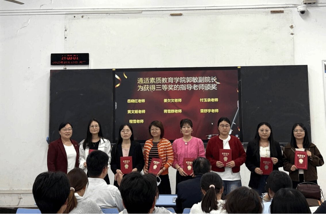 彭贤则校长助理、曾晓辉副院长、郭敏副院长分别为获得一等奖、二等奖和三等奖的学生和指导教师颁发荣誉证书和奖品,并合影留念。现场气氛热烈,掌声不断。