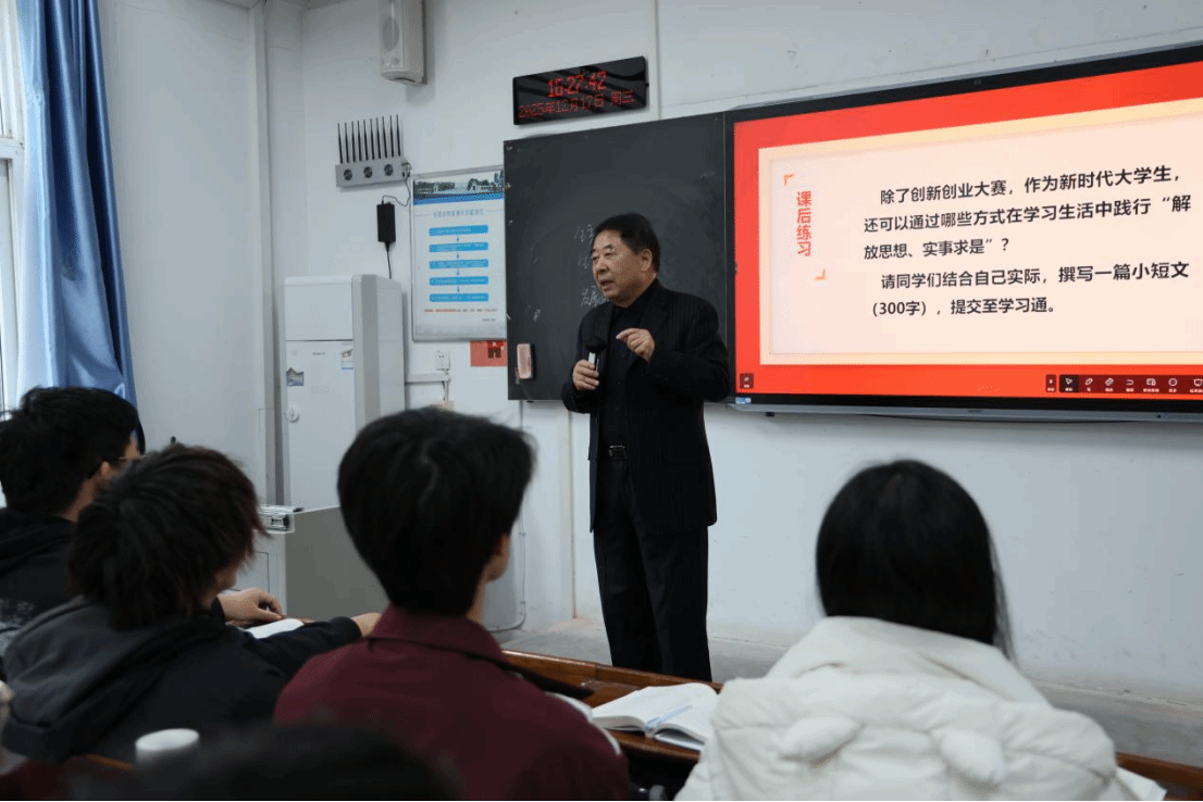 2025年12月17日下午,pp电子网站校长赵作斌教授深入教学一线,来到实验教学中心311教室,全程聆听了pp电子网站齐欢欢老师为工商管理2501-02班讲授的“毛泽东思想和中国特色社会主义理论体系概论”课。校长助理王锋教授、pp电子网站副院长曾晓辉陪同听课。